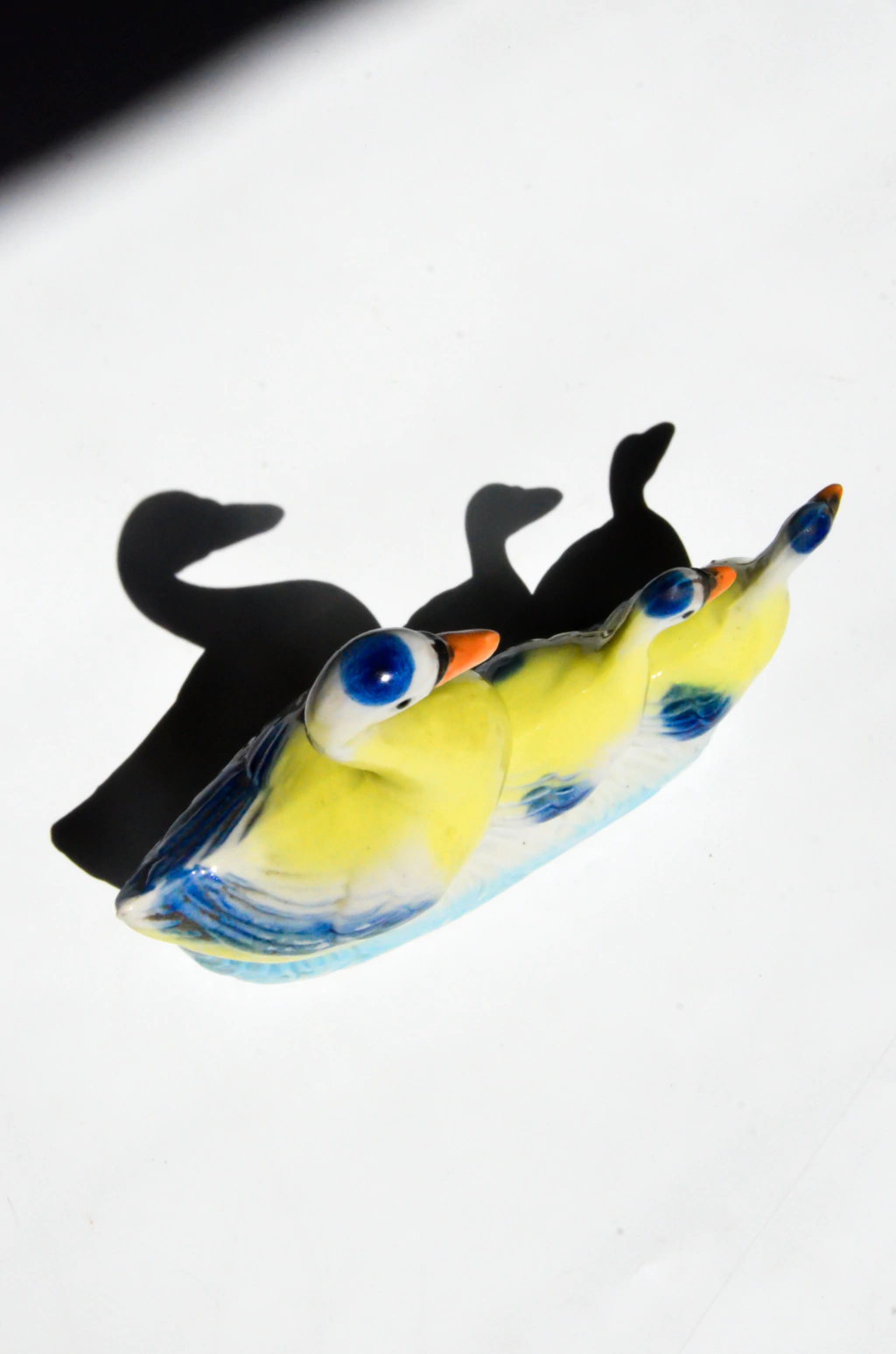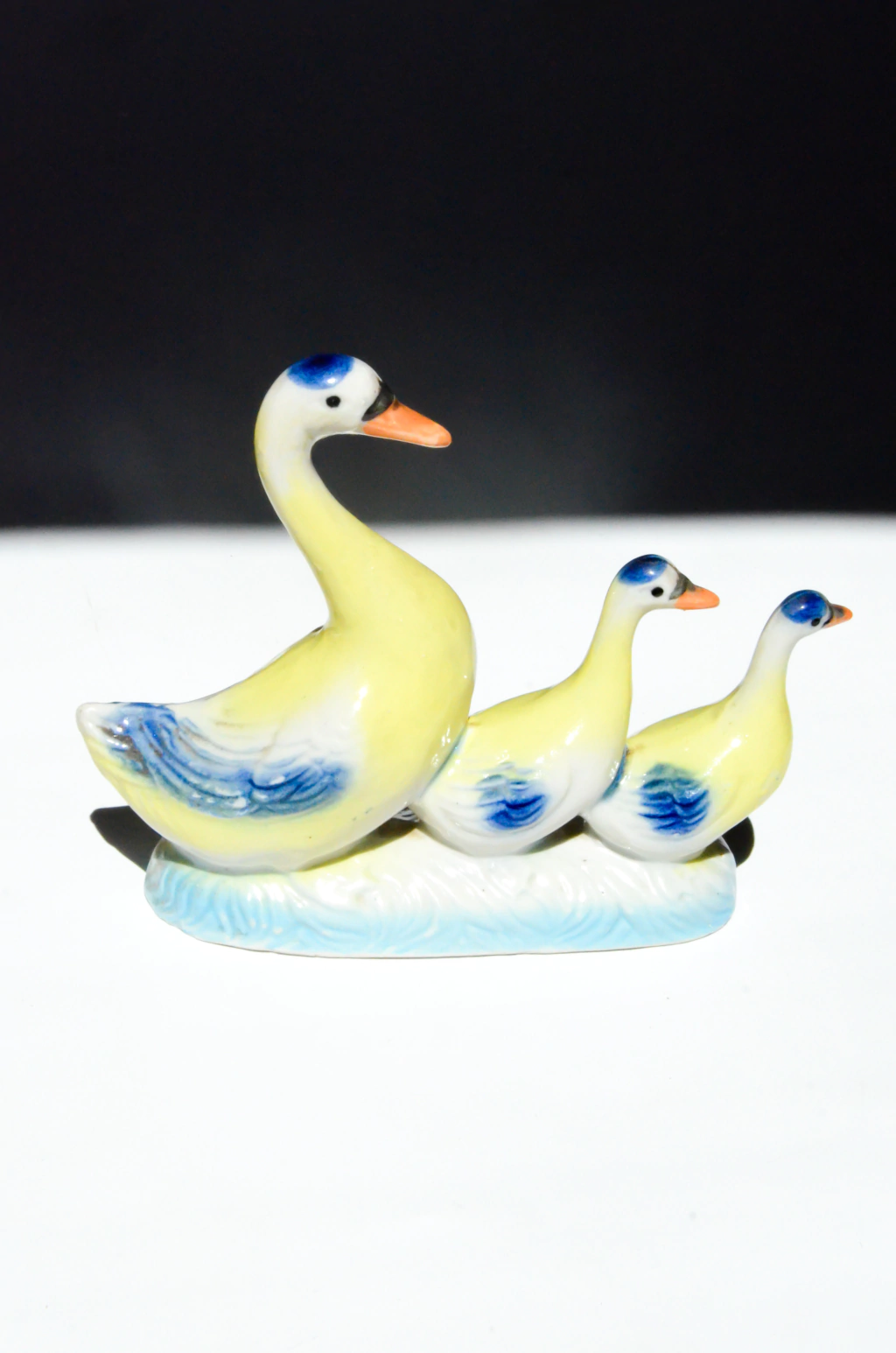 Bibelô em formato de família de patos, feito em porcelana pintada a mão. | Medidas: 19,5cm de comprimento x 5,5cm de largura x 16cm de altura.