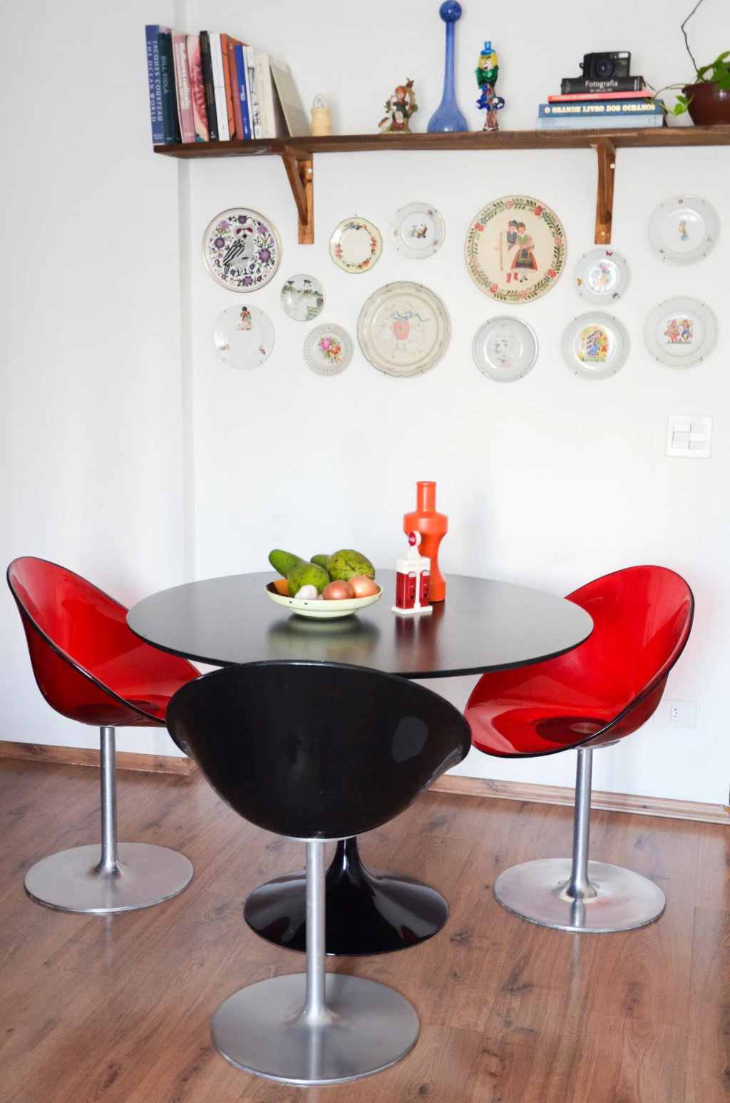 Cadeira giratória preta estilo Space Age, feita em acrílico preto e alumínio. Contêm riscados e algumas pequenas marcas tanto no acrílico, quanto no alumínio, mas nada que atrapalhe a beleza da peça. | Medidas: 81cm de comprimento x 60cm de largura x 65cm de profundidade.