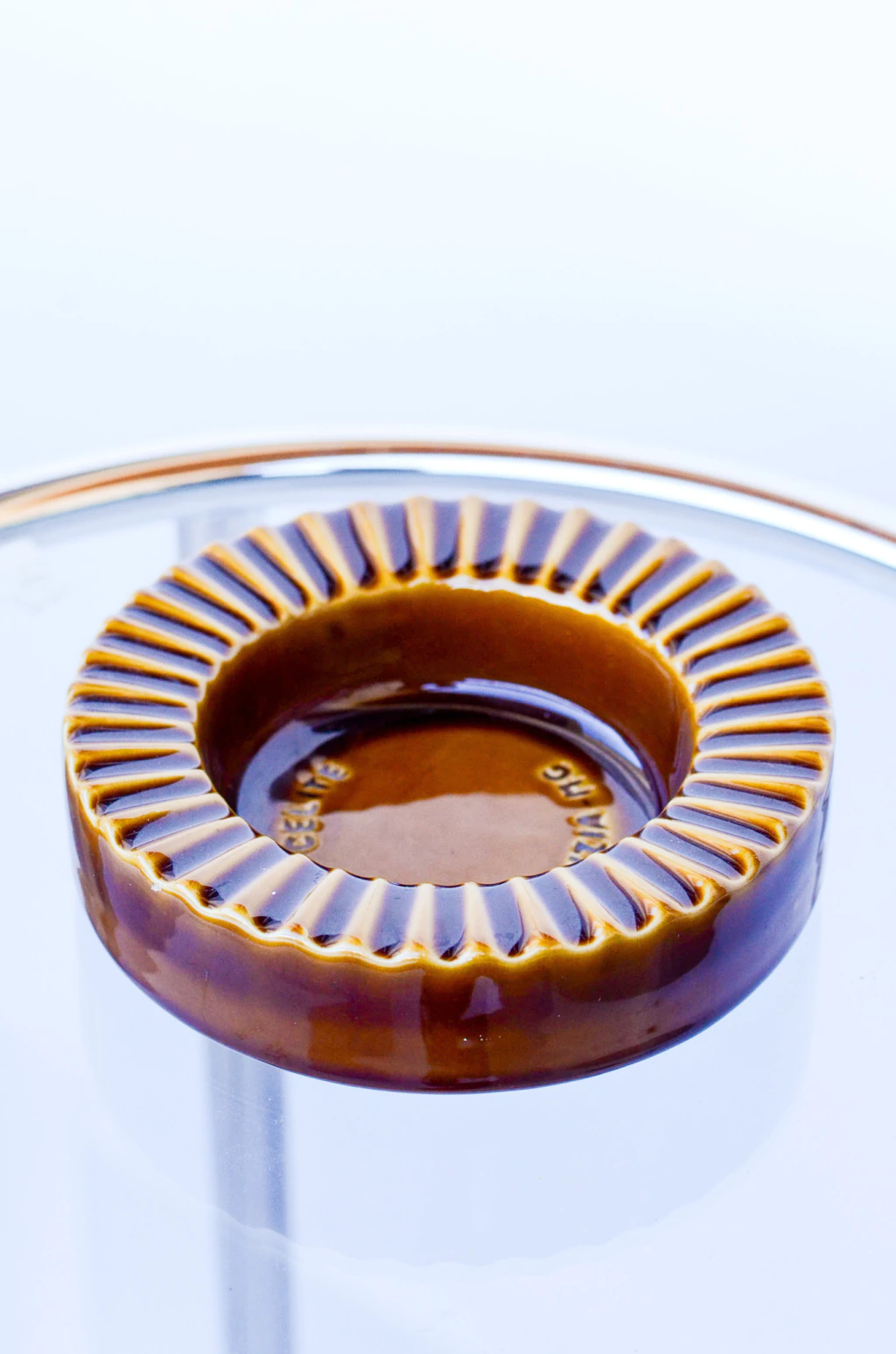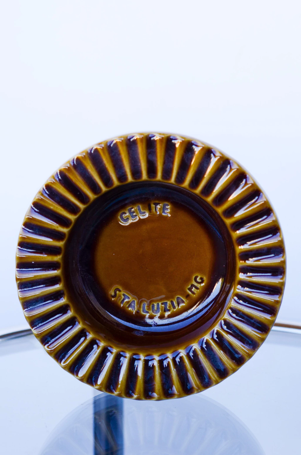 Cinzeiro marrom circular produzido pela marca Celite nos anos 50, feito em porcelana numerada. | Medidas: 17cm de diâmetro x 5cm de altura x 3cm de profundidade.