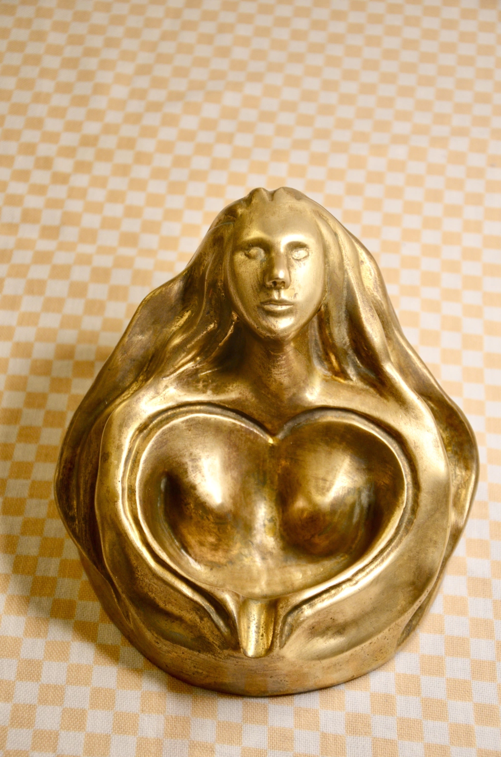 Cinzeiro em formato de mulher coração produzido pela artista Sandra Pavie em 1992, esculpido em bronze. Peça assinada e datada pela artista. | 16,5cm de comprimento x 15cm de largura x 13cm de altura.