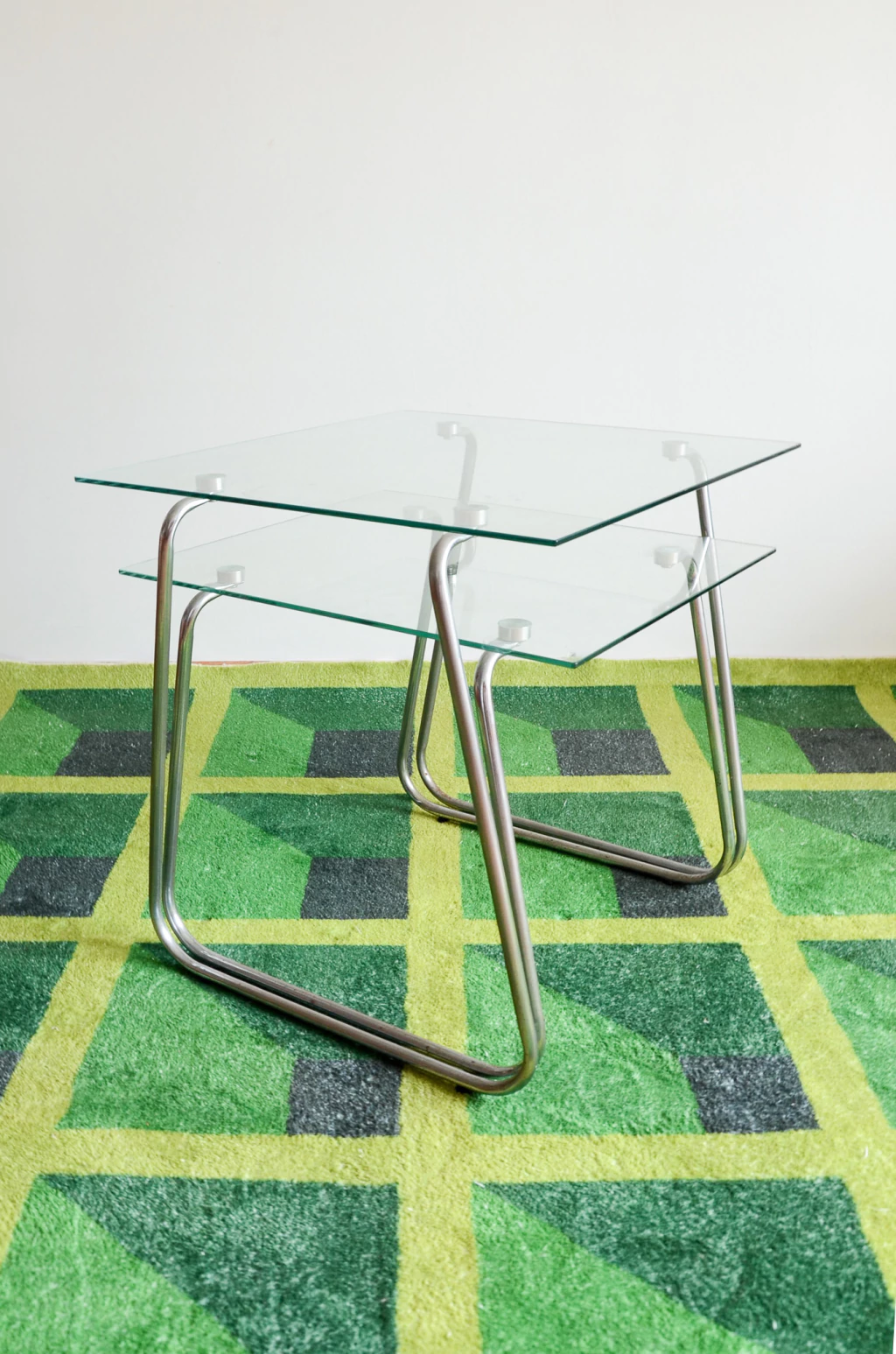 Dupla de mesas modelo "ninho", uma encaixa embaixo da outra, feitas em aço tubular cromado e vidro temperado. | Medidas menor: 45cm de comprimento x 39cm de largura x 39cm de altura / Medidas maior: 47cm de comprimento x 45cm de largura x 47cm de altura.