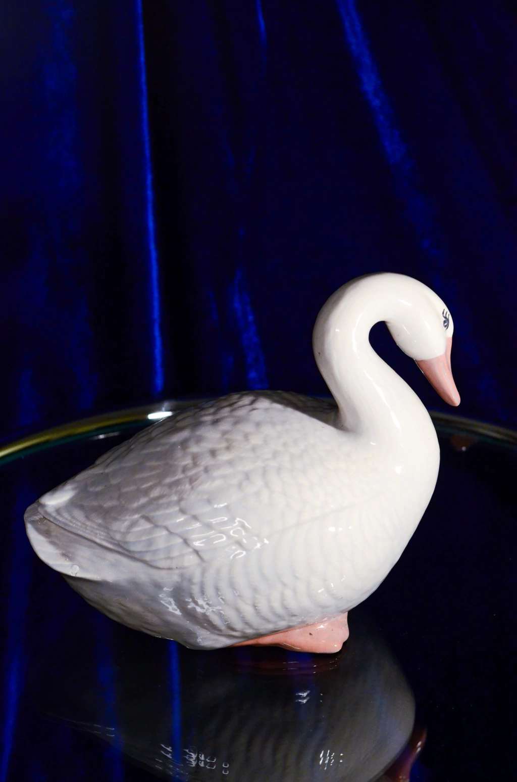 Escultura em formato de cisne branco, feito em porcelana ricamente detalhada e pintada a mão. Contêm pequeno reparo na ponta da calda, quase impercitível. | Medidas: 26cm de comprimento x 23cm de largura x 19cm de altura.