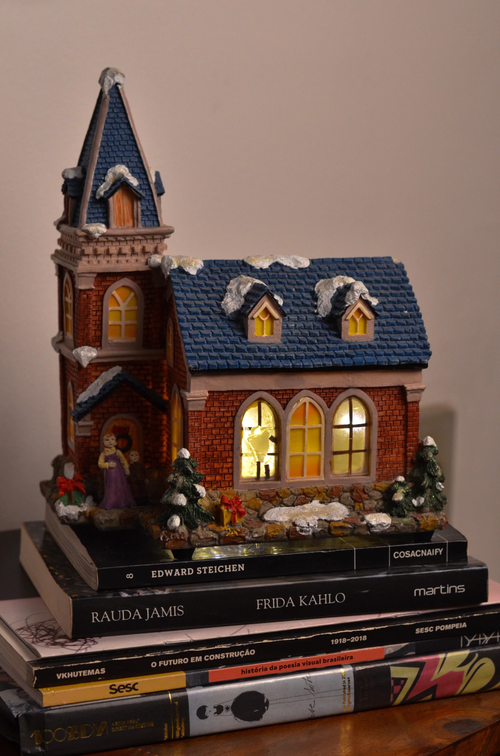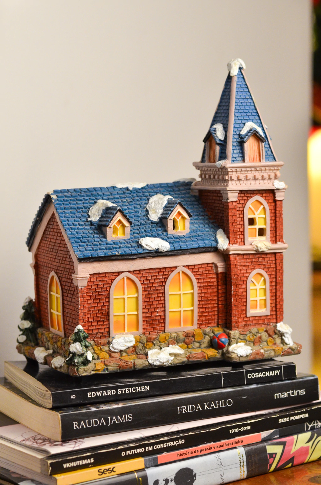 Escultura em formato de igreja natalina, feita em resina e material acrílico para simular vidro nas janelas. A peça é vazada e tem a parte de baixo aberta para caso você queira colocar luz dentro e deixa-la iluminada. Fica como mostro na segunda foto. | Medidas: 23cm de comprimento x 18cm de largura x 13cm profundidade.