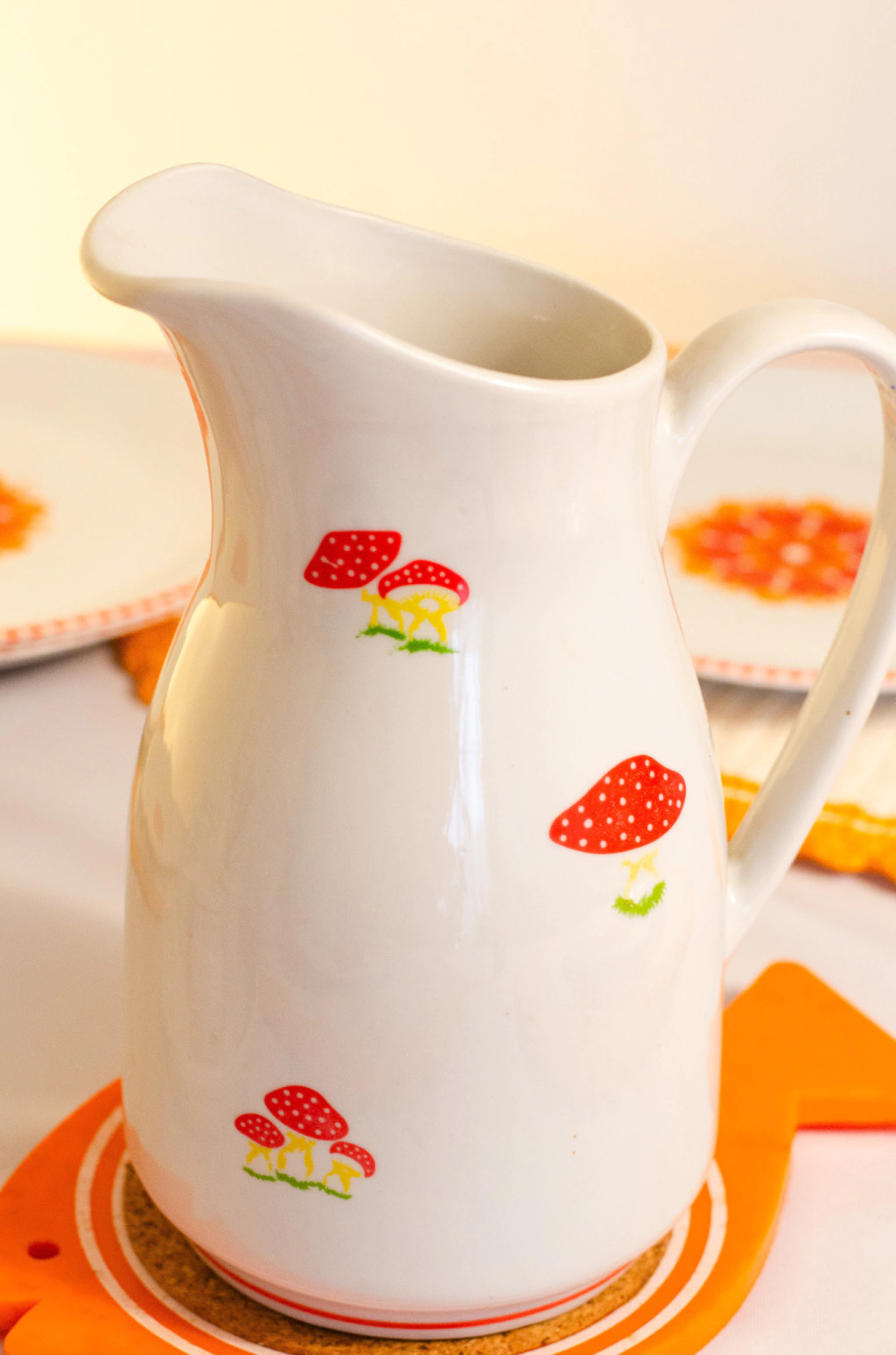 Jarra com ilustração de cogumelos da marca Porcelana Veracruz, feita em porcelana. | Medidas: 22,5cm de comprimento x 17,5cm de largura x 19,5cm de profundidade.