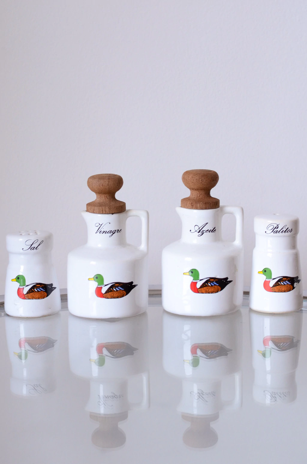 Jogo contendo porta azeite, porta vinagre, saleiro, pimenteiro e suporte/pratinho com ilustrações de marrecos selvagens, feitos em porcelana assinada. | Medidas galheteiros: 11,05cm de comprimento x 7cm de largura x 9cm de profundidade / Medidas saleiro: / Medidas pimenteiro: 7cm de comprimento x 4,3cm de largura