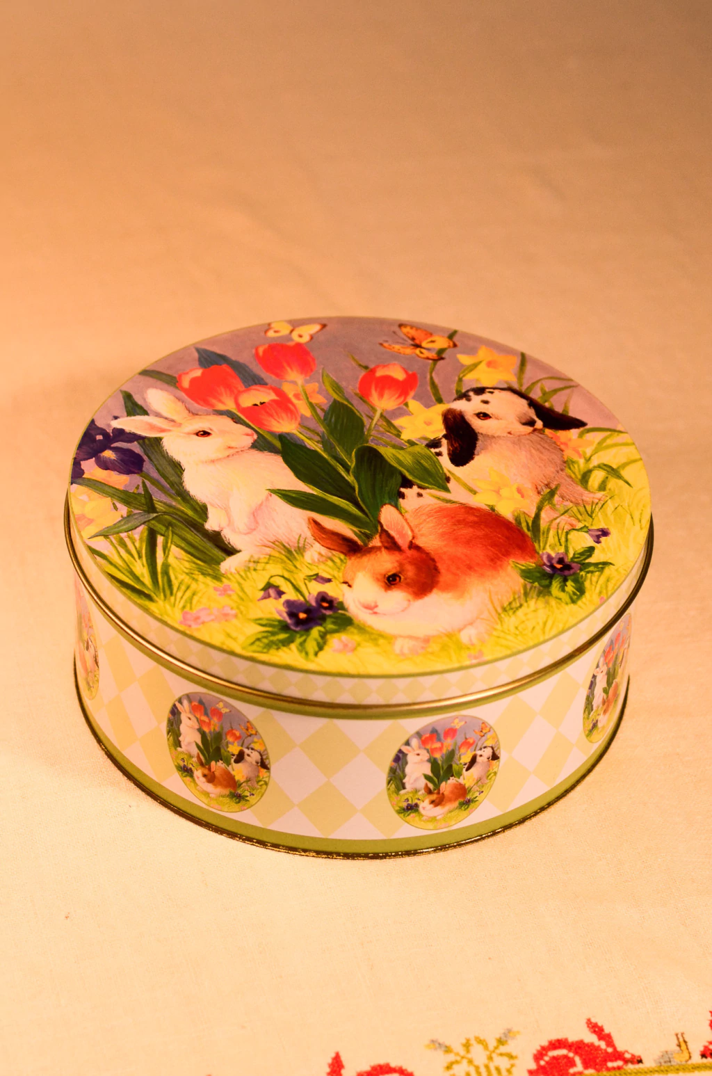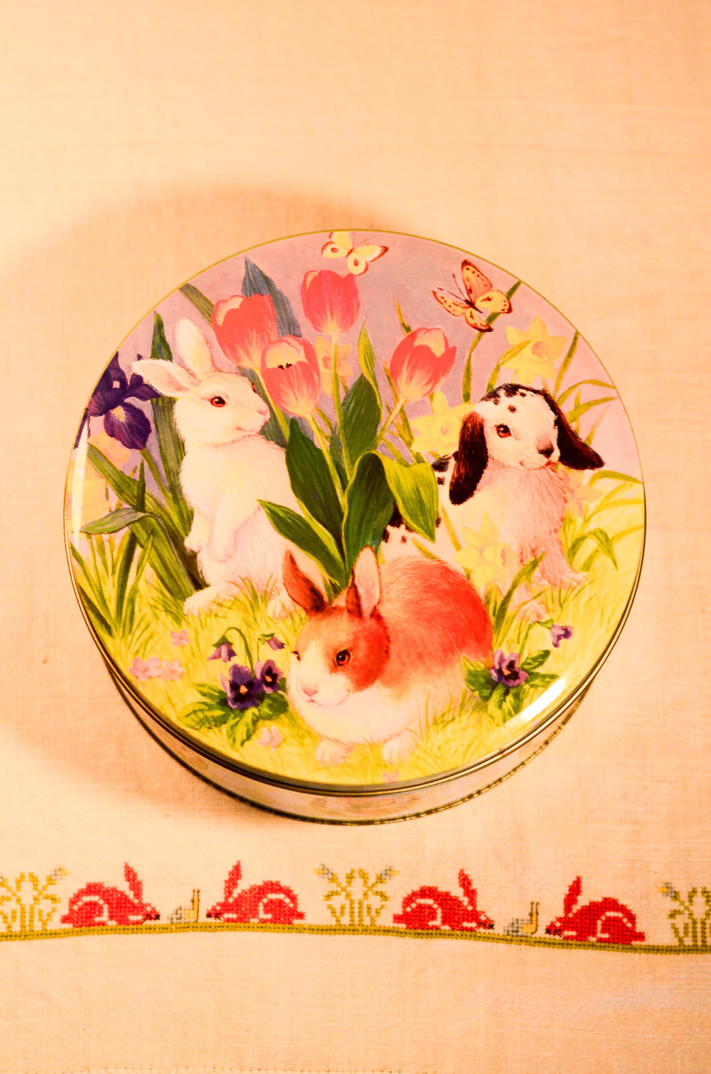 Latas em 3 tamanhos diferentes com ilustração de coelhos, feitas em metal. A menor contêm alguns pontos de oxidação na parte interna | Medidas menor: 13,5cm de diâmetro x 6cm de altura x 5,5cm de profundidade / Medidas média: 14,5cm de diâmetro x 7,5cm de altura x 6,5cm de profundidade / Medidas maior: 20cm de diâmetro x 8,5cm de altura x 8cm de profundidade