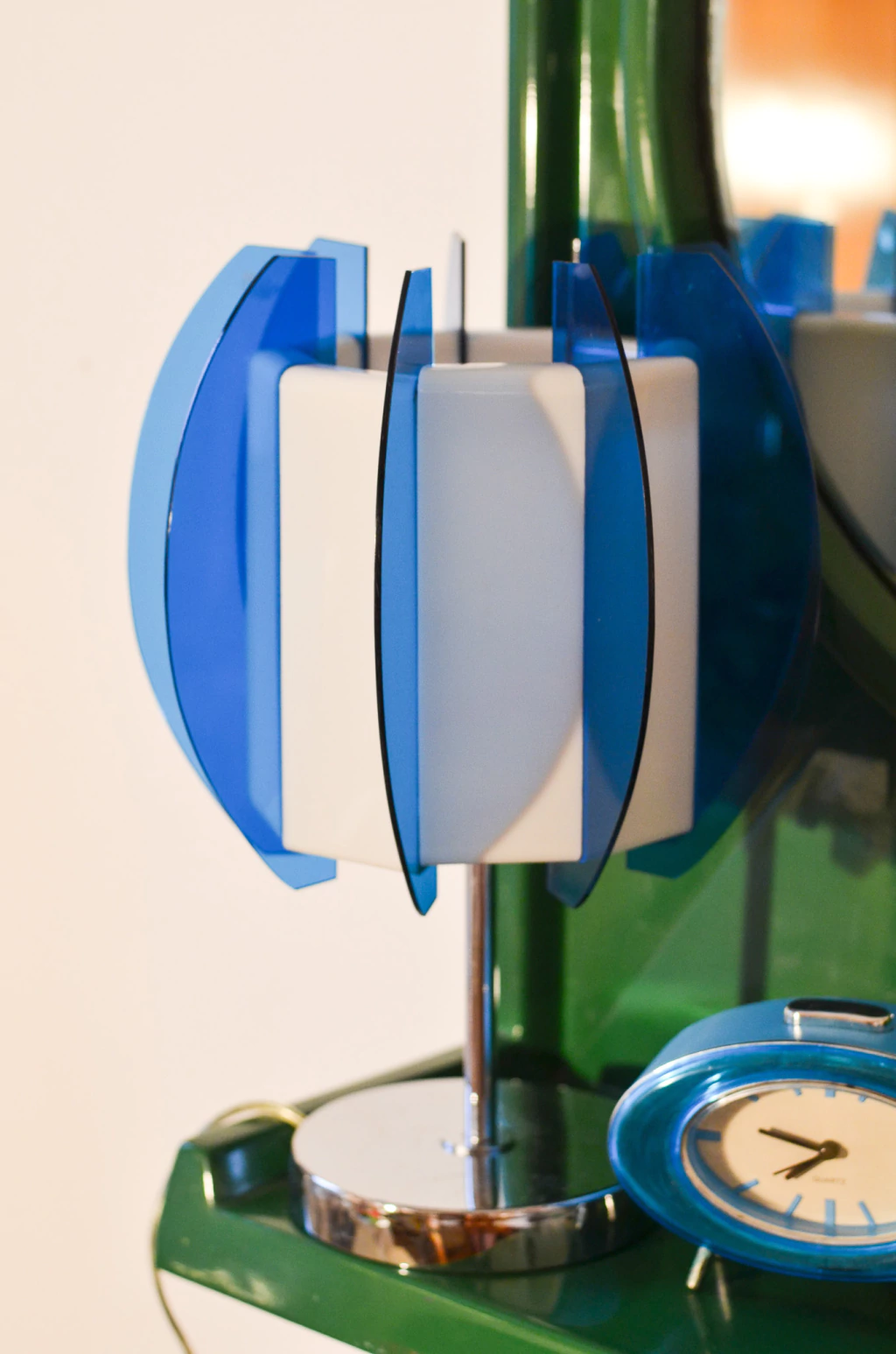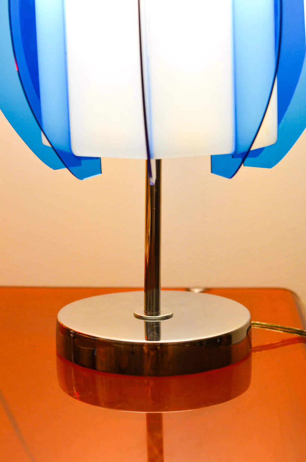 Luminária anos 70 azul e branca, feita em acrílico translúcio e leitoso, com base em metal cromado. A fiação contêm botão de liga/desliga, o bocal é para lâmpada E27, o plug para a tomada é de dois pinos e bivolt. | Medidas: 37cm de comprimento x 22cm de largura.