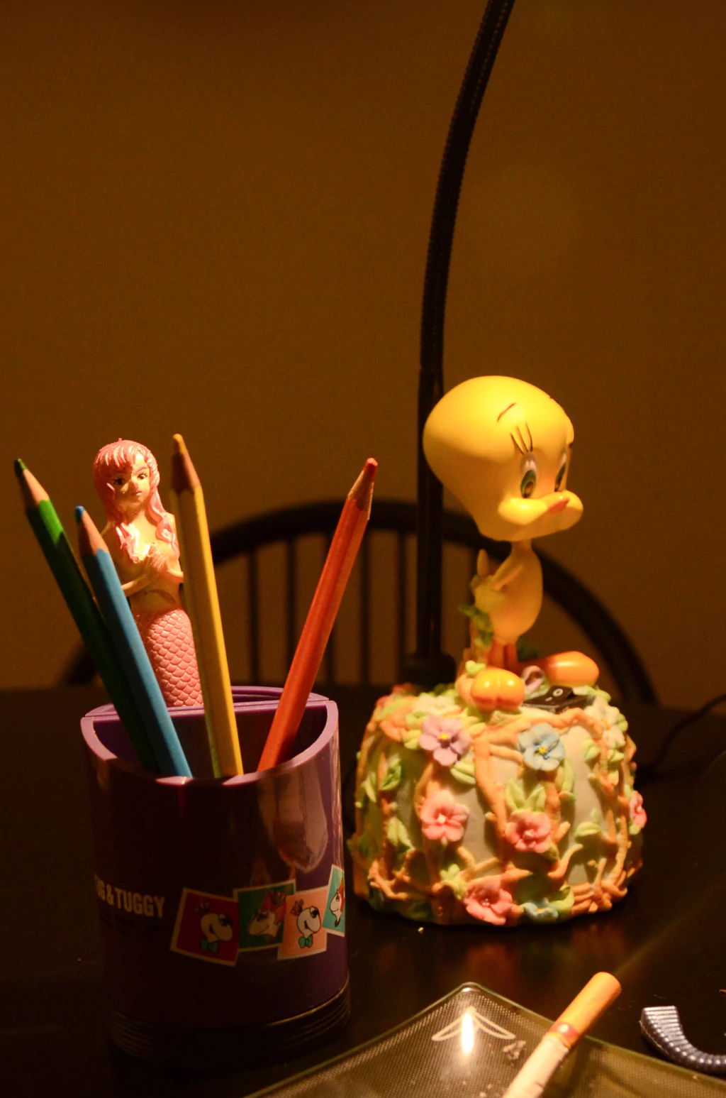 Luminária de mesa com escultura na base representando o personagem Piu-Piu dos Looney Tunes. A peça foi produzida pela Warner Bros nos anos 90, feito em resina e metal. Acompanha caixa original. Está funcionando, tem botão de liga e desliga, é 110v. | Medidas: estica até 46cm de comprimento x 9m de largura.