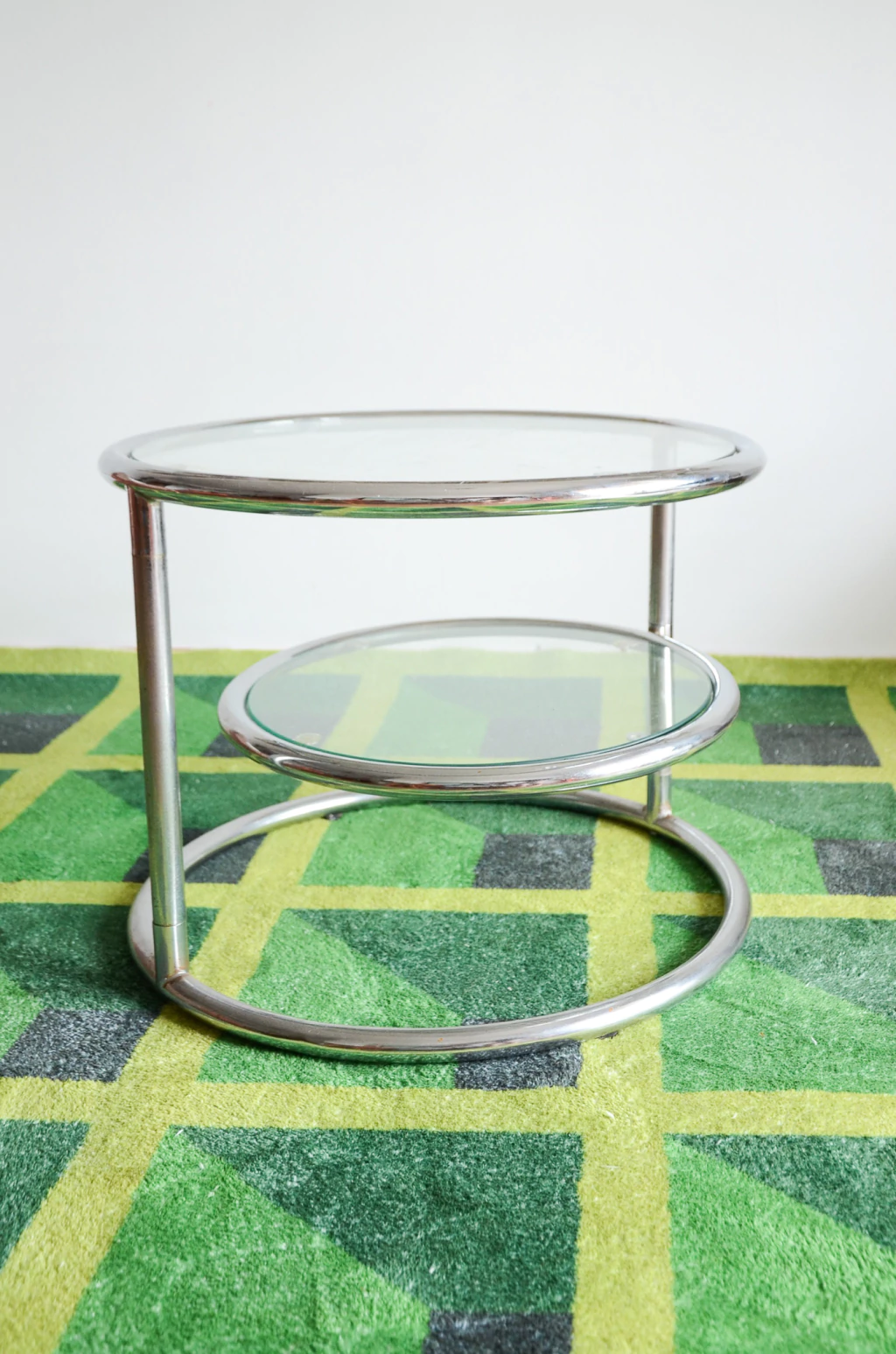 Mesa cromada modelo estilo Milo Baughman, contêm três prateleiras, a central é articulável para os lados, feita em aço tubular cromado e vidro temperado. Acompanha três vidros e contêm alguns pontos de oxidação no aço. | Medidas: 55cm de diâmetro (vidros das pontas) x 45cm de diâmetro (vidro do meio) x chega até 90cm de largura x 40cm de altura.