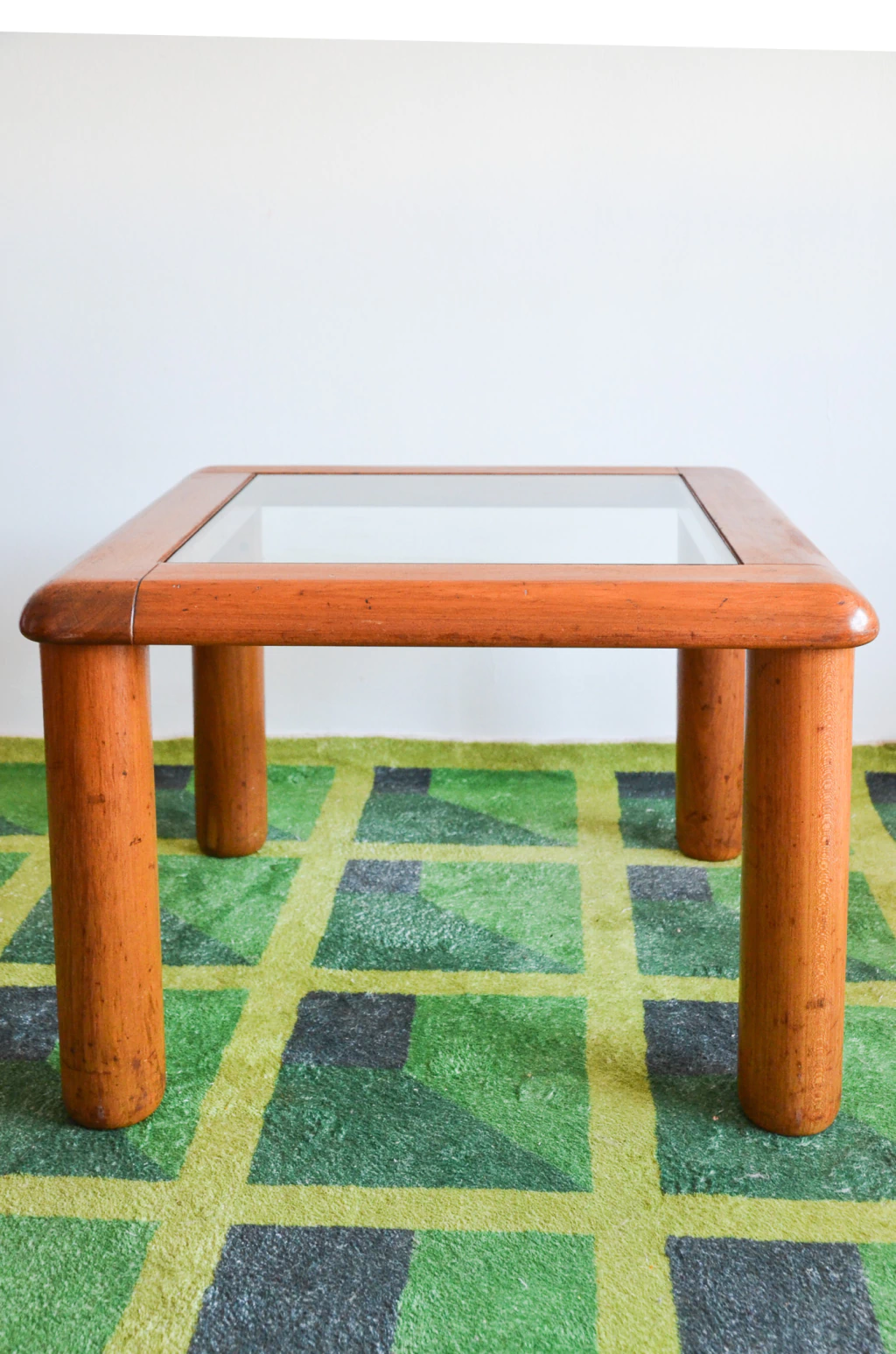 Mesa quadrada produzida nos anos 70 pela marca Hobjeto, com design de Geraldo de Barros, feita em madeira maciça e vidro. Contêm um único riscado no vidro. | Medidas: 70cm de comprimento x 70cm de largura x 50cm de altura.