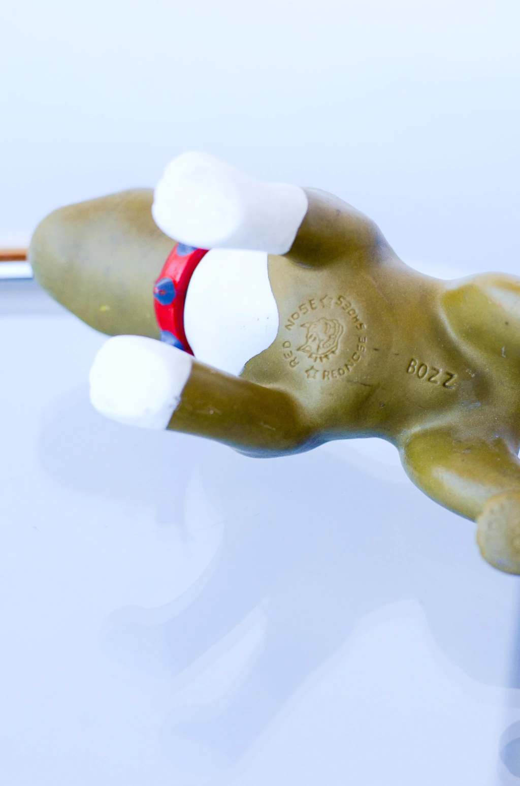 Boneco em formato do mascote da marca Red Nose produzido nos anos 2000 como brinde para compradores de produtos das marcas, feito em plástico rígido. Contêm leves desgates em algumas partes da pintura. | Medidas: 11cm de comprimento x 5cm de largura x 8cm de profundidade.