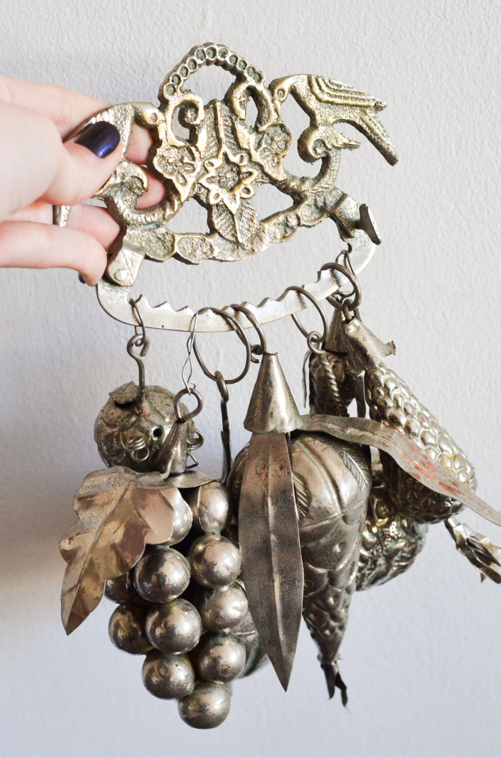 Penca de balangandã com 7 pingentes, feita em metal, contêm alguns sinais de oxidação e um dos pingentes está com um desgaste no banho. | Medidas: 30cm de comprimento x 20cm de largura.