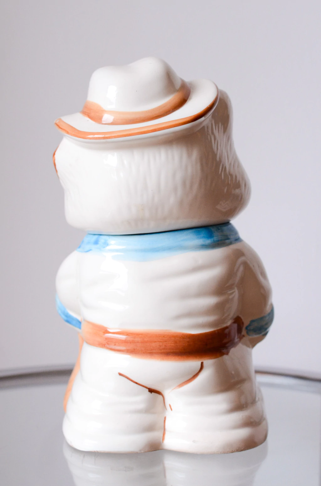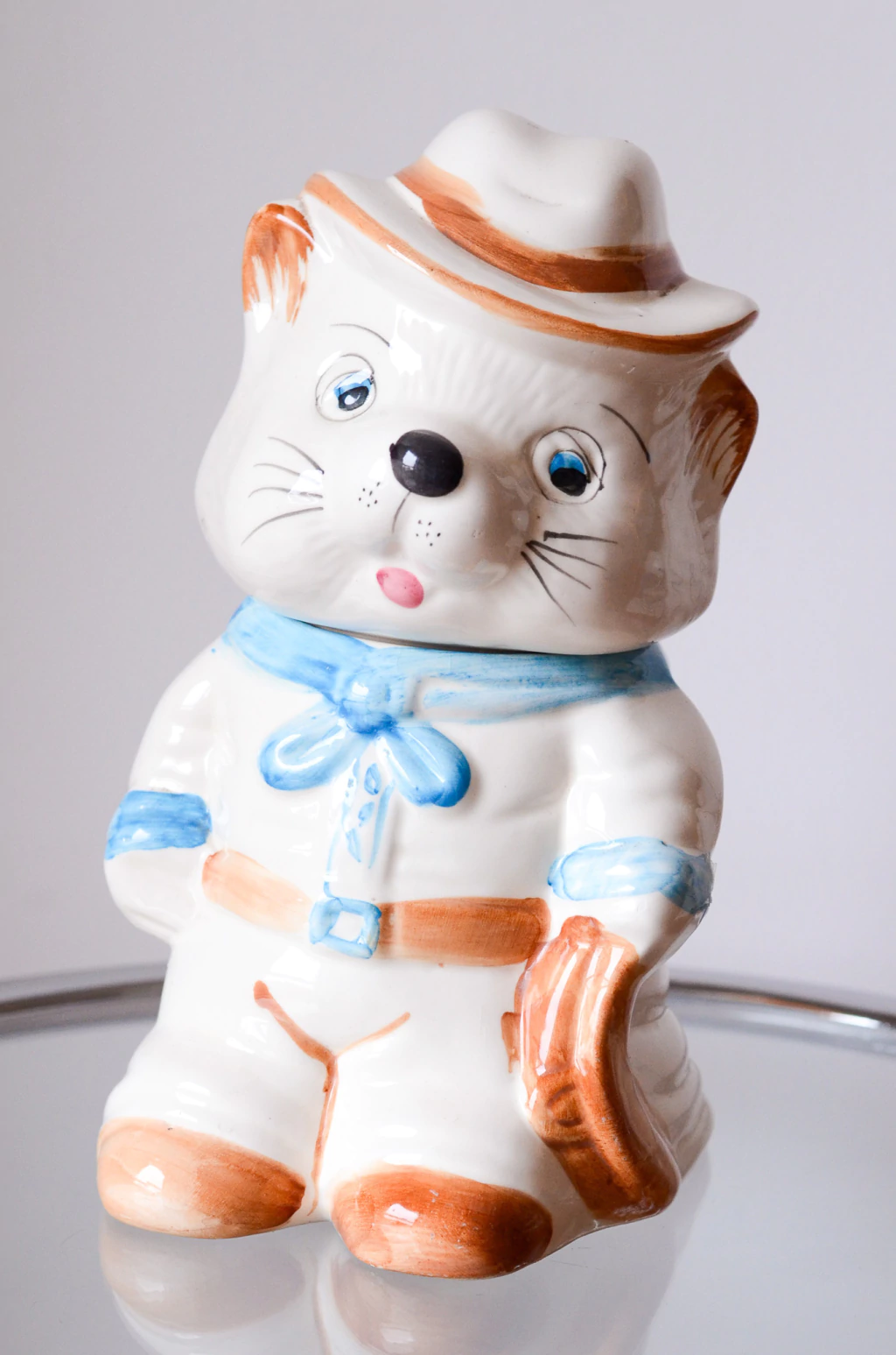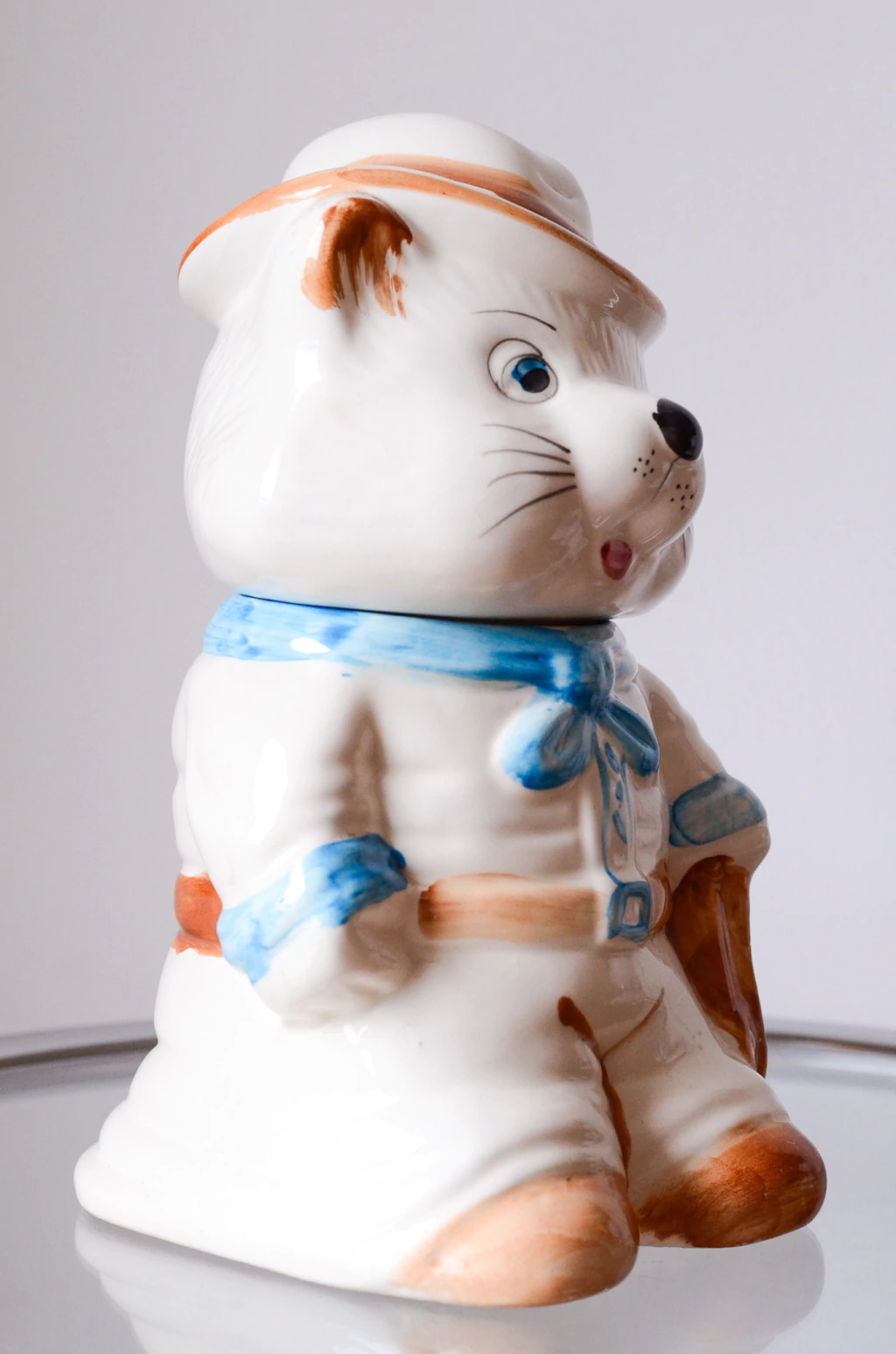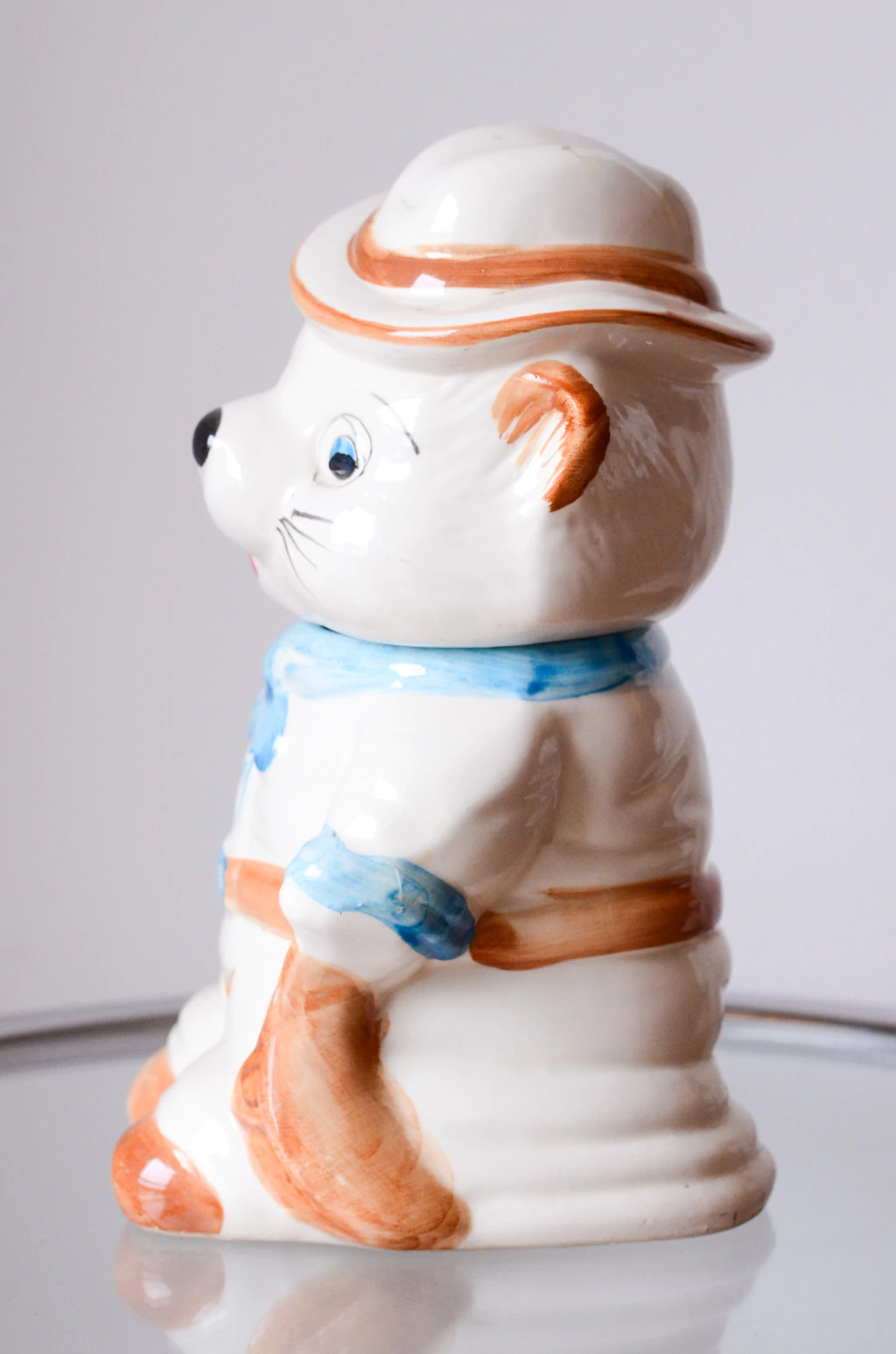 Pote em formato gato aventureiro produzido pela marca Unicer, feita em cerâmica pintada a mão. | Medidas: 30,5cm de comprimento x 20cm de largura x 17cm de profundidade.