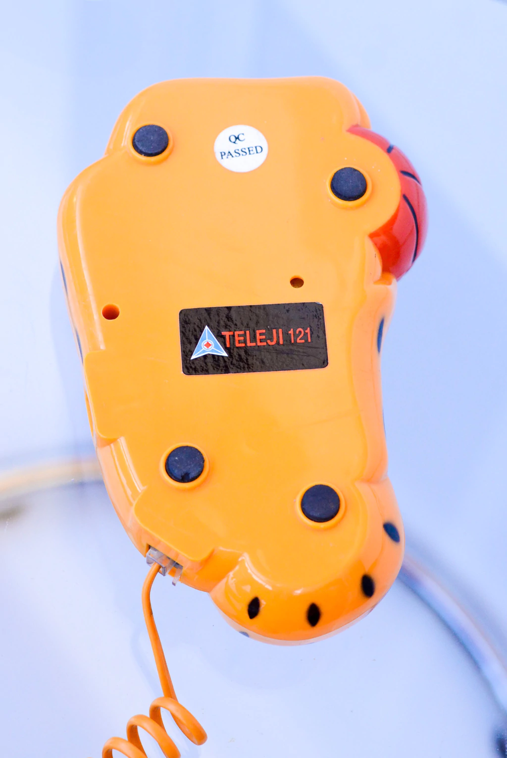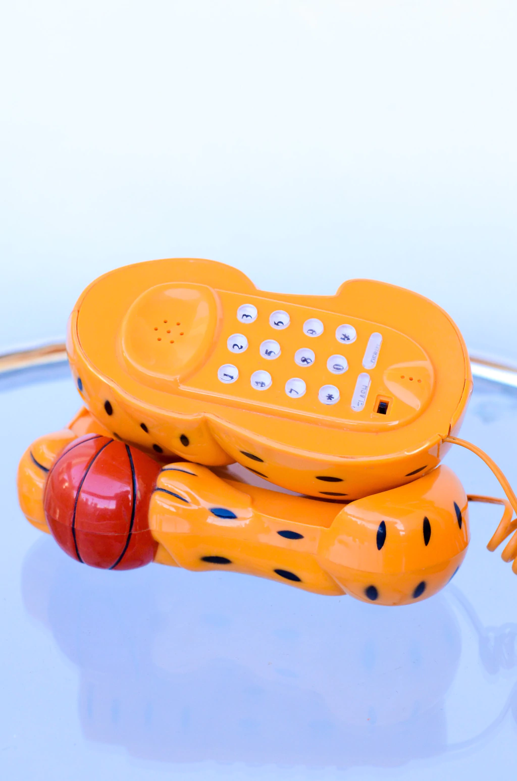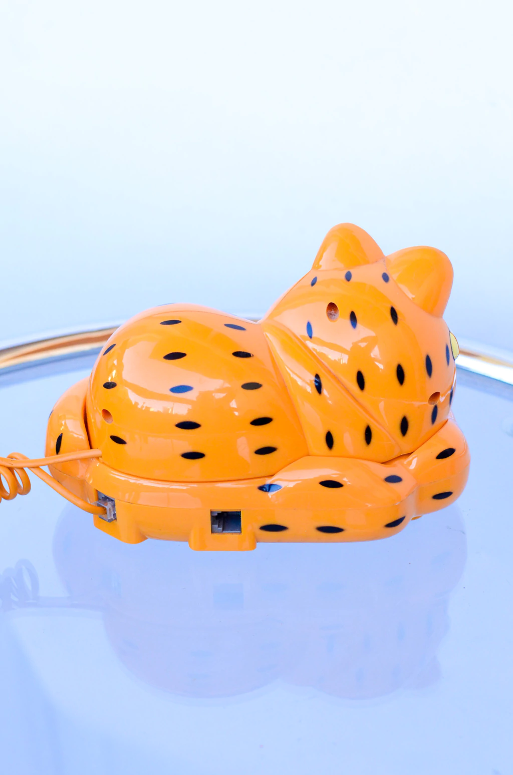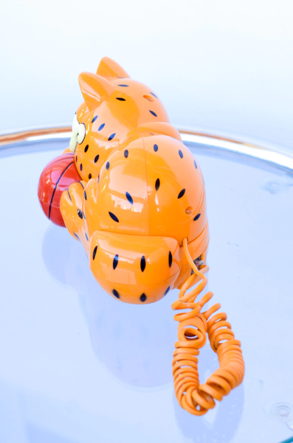 Telefone em formato do personagem Garfield segurando uma bola de basquete produzido em 1980 pela marca Teleji, feito em plástico duro e companha fio. | Medidas: 17cm de comprimento x 11cm de largura x 12cm de altura.