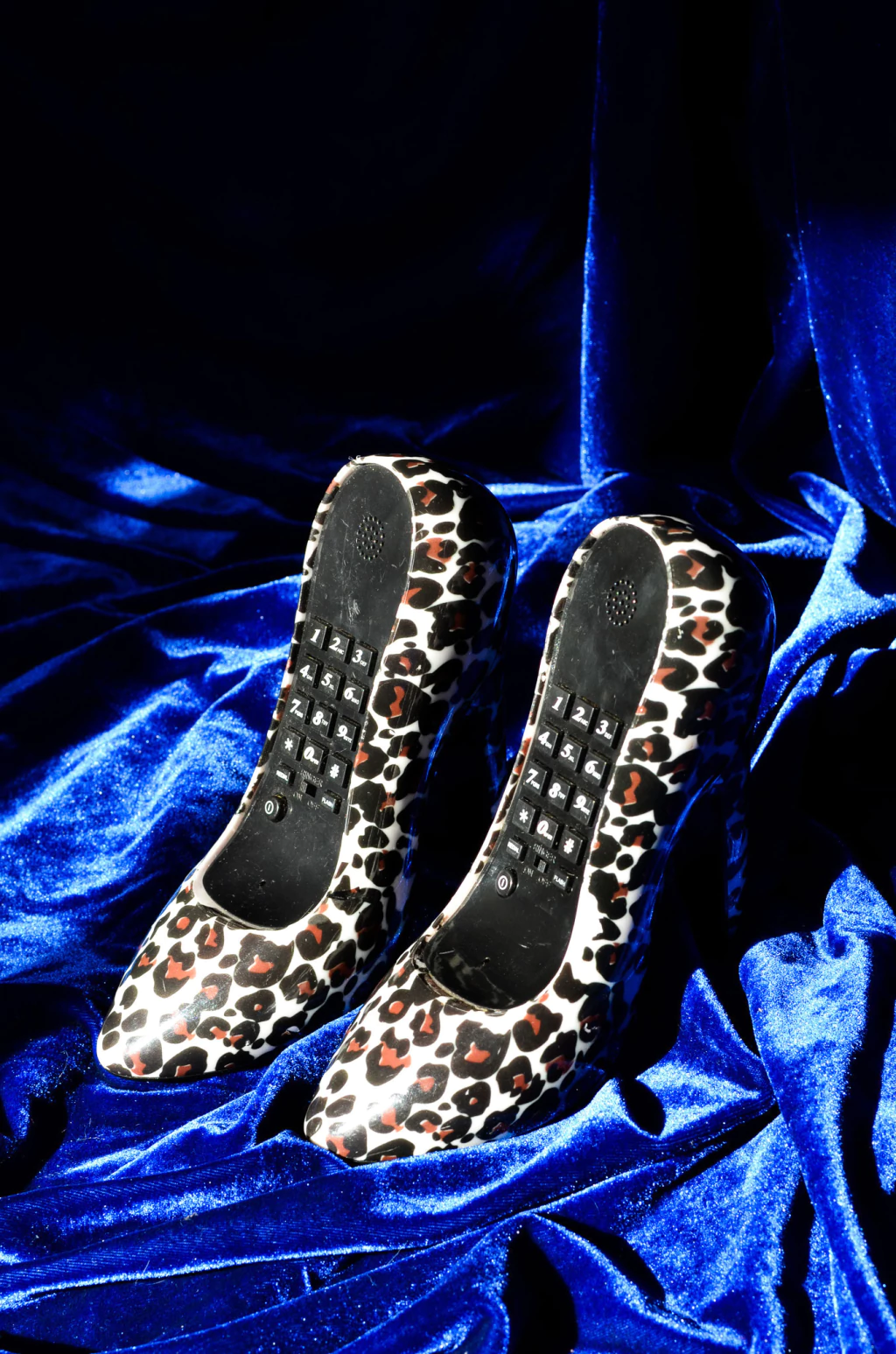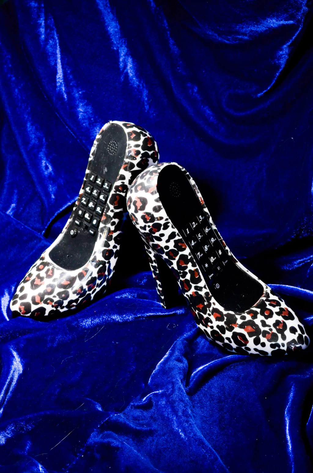 Telefone em formato de sapato de salto alto com estampa de oncinha, feito em plástico duro. Tenho duas unidades. | Medidas: 15,5cm de comprimento x 7cm de largura x 15cm de altura.
