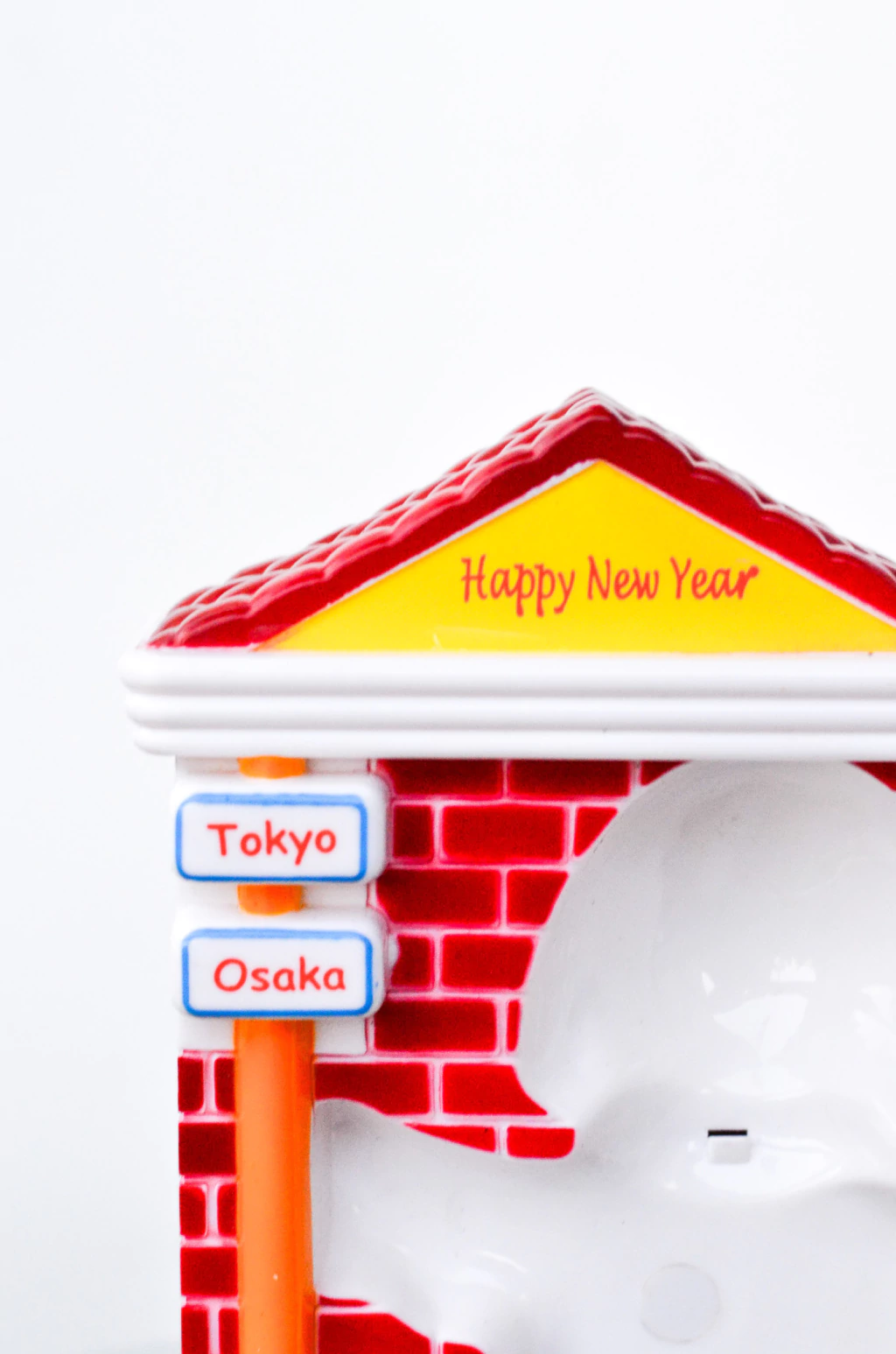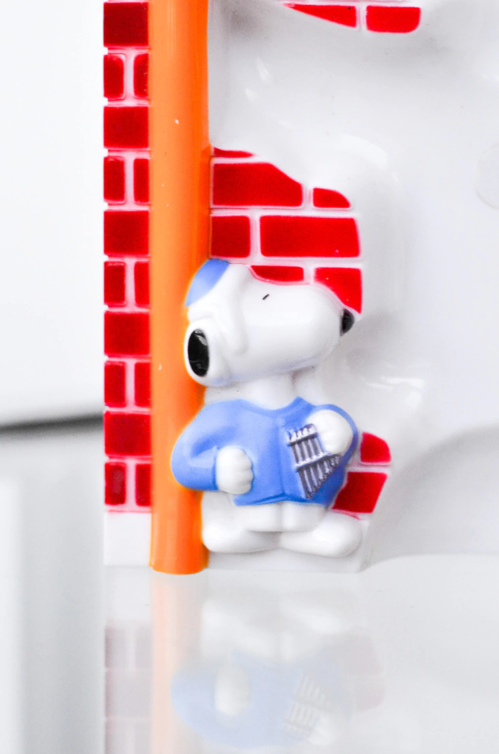 Telefone em formato do personagem Snoopy apoiado em uma parede de tijolos, com temática "Ano Novo", feito em plástico duro. Acompanha fio e caixa original. | Medidas: 20cm de comprimento x 13,5cm de largura x 10cm de profundidade.